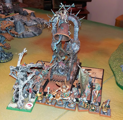 La ira del Hombre árbol ante la corrupción que rodeaba la Campana Gritona lo llevó a atacar con furia desmedida la horda Skaven y al Vidente Gris. Con el apoyo del propio Durgrim de Az-Karak al mando de sus fieles Martilladores, que acababan de aniquilar el Carruaje Negro, la unidad rátida fue aniquilada, si bien el señor enano lo pagó con serias heridas. El Señor de la Muerte Snikch también tuvo que abandonar la refriega, aunque previamente se encargó de eliminar al Archimago Asur. El propio Señor de Tor Achare y su portaestandarte de batalla se vieron obligados a una retirada ante el empuje Skaven. Los Arbóreos tampoco estaban dispuestos a permitir a los Monjes de Plaga contaminar los bosques sagrados, logrando abatir al Sacerdote de Plaga en Pebetero y reducir la unidad de Druchii ballesteros de la colina, antes de ser eliminados por los vapores tóxicos.